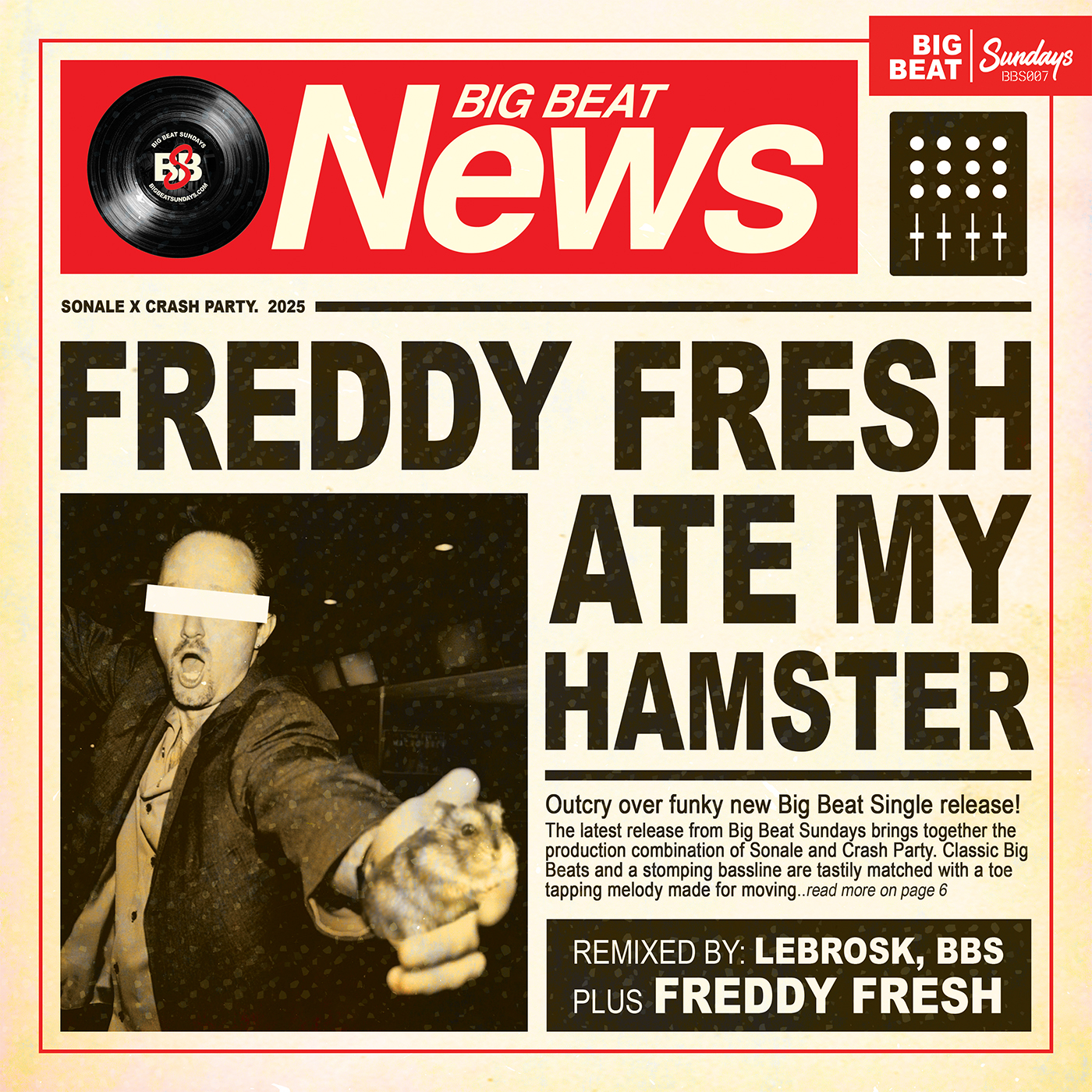 Big Beat Sundays is back with their first track of the year and this one is a Big Beat Party starter from start to finish. “Freddy Fresh Ate My Hamster” sees the producers Sonale and Crash Party combine their talents to mould this Big Beat belter. Big beats, horn stabs, Looped vocals, phat bass and cheeky synthesis - All the ingredients for any Big Beat era tune.